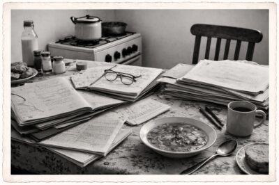 Mama aducea adesea munca acasă. Seara, masa noastră din bucătărie devenea birou de cercetare: dosare, hârtii, tabele, creion, notițe, materiale de la Institutul de Statistică. Între timp gătea, ne susținea în toate cele și continua să lucreze cu o disciplină și o forță pe care abia astăzi cred că le înțeleg cu adevărat. Noi copiii am numit perioada aceea „supele de prognoză“.